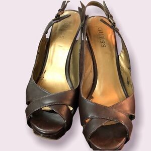 Brown leather Guess peep-toe platform sling backs with 5” heels and 1.5” platform. Interior gold finish is peeling. Good condition with a few scuffed spots. Overall a really sexy shoe.