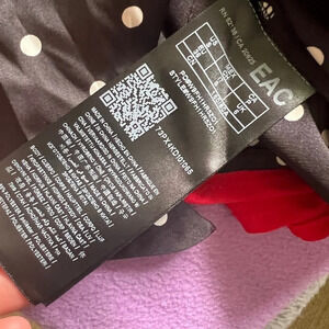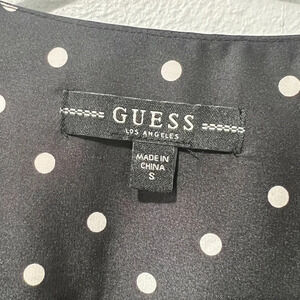 Adorable Guess branded black and white polka dotted blouse with button front closures, tie waist detail, semi cropped fit (hits right about the waistline), silky fabric, round neckline, button wrist cuffs.