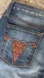 Medium blue denim with classic five-pocket style and faded thigh. Features beautiful stitching and studs on back pockets.