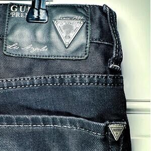 ntroducing the Guess Premium Lincoln Slim Straight Los Angeles Jeans in Black, featuring a 5-pocket design and a zippered closure. Made from a comfortable cotton blend fabric with a dark wash, these jeans are perfect for any season - whether it's winter, summer, fall, or spring.