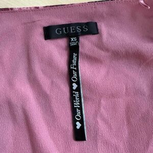 Beautiful long sleeve printed dress by Guess with a striking mix of paisley, animal, and abstract motifs in pink and plum tones. Features a wrap front, button cuff sleeves, flowy high-low hem, and flattering waist tie detail