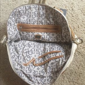 @missme02 Sorry I just saw this now, the colors in the picture are pretty accurate...various earth tones, browns w/ a cream trim and silver Guess logo.