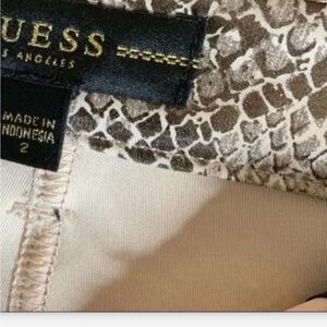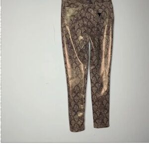 Guess barely there poison python coated pant. Size 2. The sleek sheen of the GUESS Poison python-print pants fits like a second skin that brings instant edge to any look. Approx. inseam: 27’ 10" leg opening, High rise sits at natural waist Zipper and button closure at front fly; belt loops 89% Polyester, 11% Spandex.