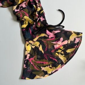 Long sleeve semi-sheer floral ruffle top with ruched details with bell sleeves.