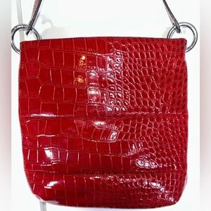 Stylish red crocodile embossed shoulder bag with a chic design. Perfect for adding a pop of color to any outfit.