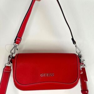 This striking red crossbody bag from Guess features a sleek, structured design with silver-tone hardware and a minimalist aesthetic.