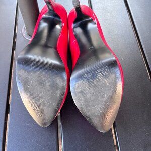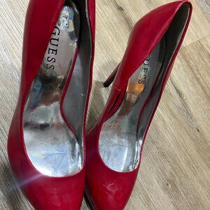 Step out in bold, timeless style with these striking red patent leather pumps from GUESS. Featuring a slightly rounded pointed toe, glossy finish, and a classic stiletto heel, these pumps elevate any outfit—perfect for evening events, office wear, or a night on the town. The cushioned insole ensures comfort while the polished design adds a touch of sophistication to every step. Make a statement with effortless elegance.