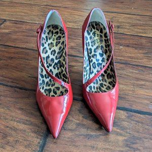 This is a beautiful pair of red patent retro winklepicker style pointed-toe heels by Guess. They have a padded leopard print insole and a lovely diagonal strap with a red button. The stiletto heels are deadly yet these are quite comfortable and the scalloped edges make these stand out.