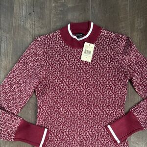 Stylish red sweater with intricate pattern. Features ribbed cuffs and collar. Perfect for casual wear.