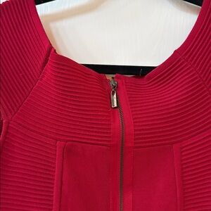 Chic red mini dress by Guess. Features ribbed texture and sleeveless design. Perfect for a night out.