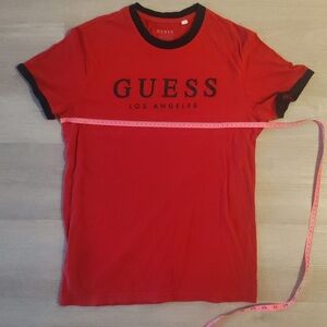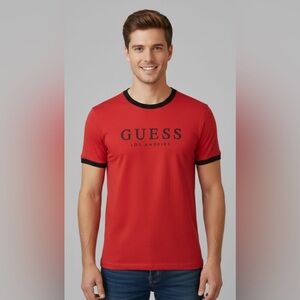 Vibrant red tee with black accents. Bold Guess logo on front. Ideal for casual wear.