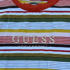 This Guess tee features a vibrant red and pink color scheme with a classic crew neckline. Made from soft cotton, it offers comfort and style with its short sleeves and iconic brand logo across the chest.