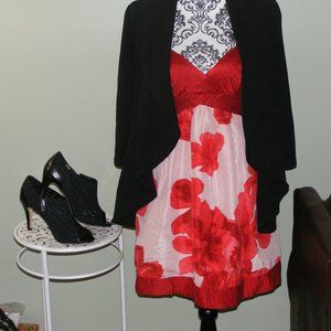 Guess red and white floral dress size 9 EUC.Beautiful floral dress has an attached under slip with adjustable straps.It's an airy and flowy dress that can be worn in different ways.(see pics) .100%silk lining /65%polyester/ 35% cotton/Dry Clean Only Measurements are 12"across bust 19"length from under bust.Also has a zipper on the left side.