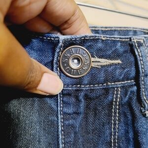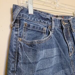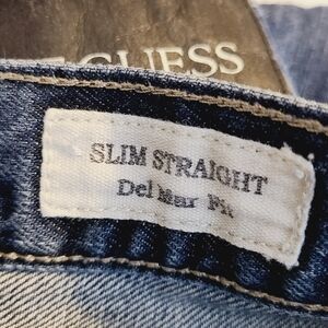 Vintage denim men's Delmar Slim Fit Guess jeans re-purposed into a women's denim A-line skirt, size 31" waist. Five pockets. Fabric, size and care tags missing; please see pics above and measurements below.