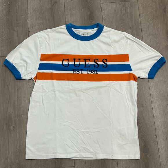 Guess Retro Ringer 90s Orange Blue White Stripe Tee T Shirt Size Small S B14