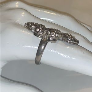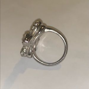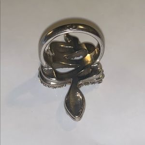 Silver tone ring with serpent in strike position, encrusted with rhinestones. “G” marking in center of band. Pre-loved, excellent condition, no rhinestones missing. Ring size 8.