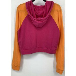 A women's sweatshirt hoodie from Guess in a Rhylee Raglan Sweatshirt in a pink punch color. The sweatshirt is short in lenght crop or would hit at waist, long sleeve, and the shirt is new with tags.