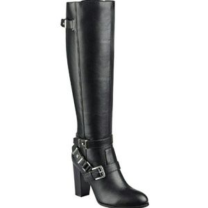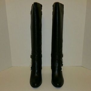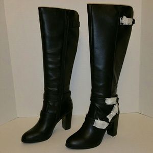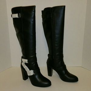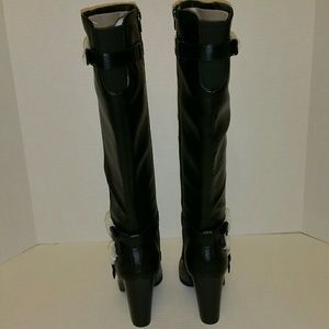 Silver-tone metallic buckles. Lined insole. 3.25 inch block heel. Zip closure. Synthetic leather. Pet and smoke free environment.