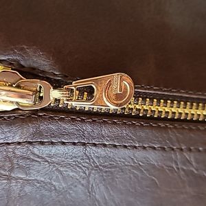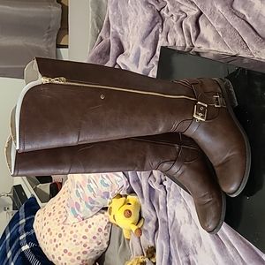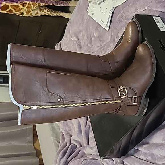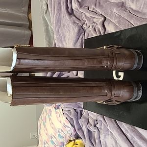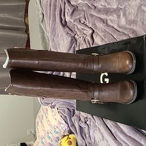 Dark Brown Harson Guess riding boots with gold accents. Zip up boots