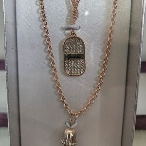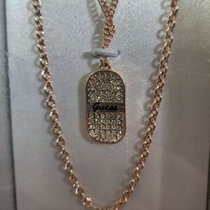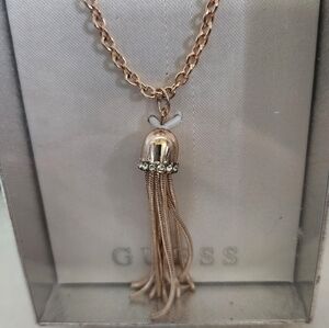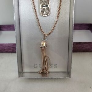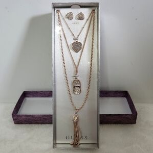 NIB Guess Los Angeles Rose Gold Tone Rhinestones Heart Triple 3 Layered Necklace Earrings Gift Set. 16" heart with rhinestones pendant with matching heart post earrings, 20" Guess logo rectangle rhinestone pendant, 24" tassel rhinestone pendant embellishments. Great for gift giving! Brand new in box!