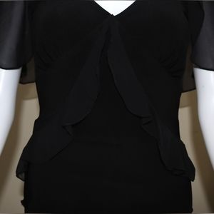 Features sheer, split sleeves with low cut V neckline and ruffle detail along the front.