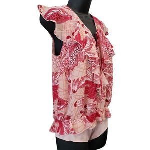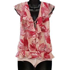 Guess Ruffle Lace Up Blouse Bodysuit Women's MEDIUM Pink White Floral V-Neck NEW