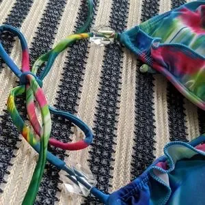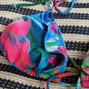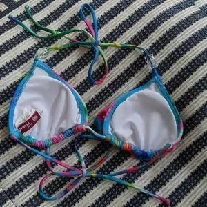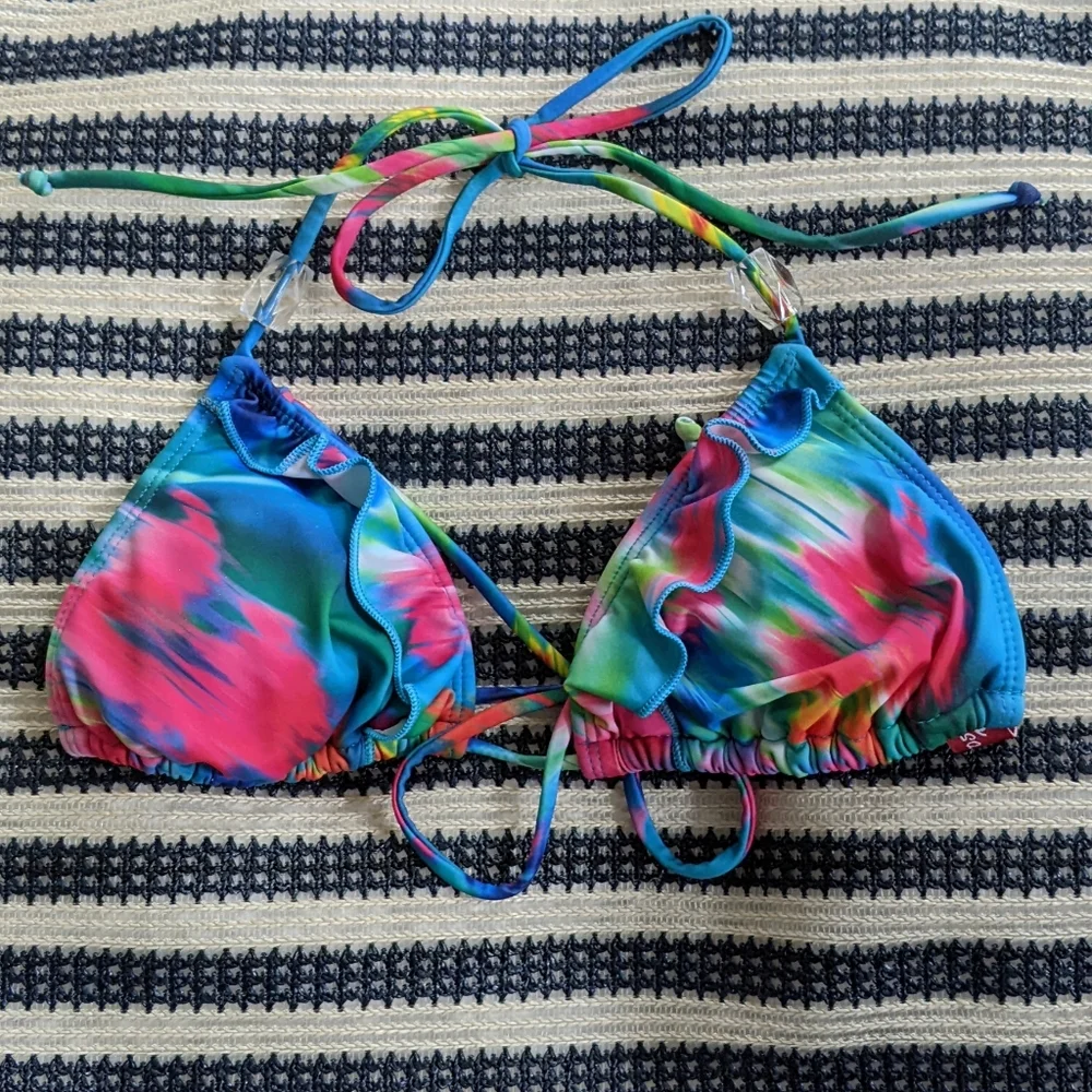 Guess Ruffled Abstract/Multi Triangle Bikini Top, Small