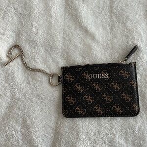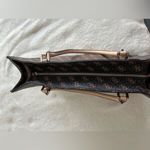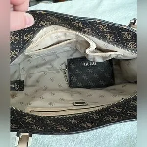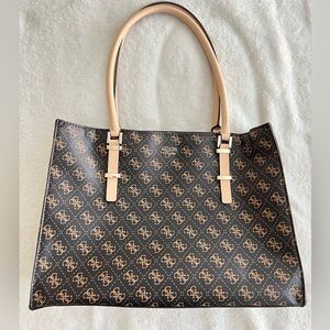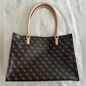 Guess tote bag with Guess monogram print. 10 inch long tan straps. Includes zip wallet pouch. Inside has 3 slip pockets and one zipper pocket.