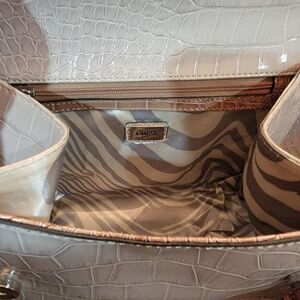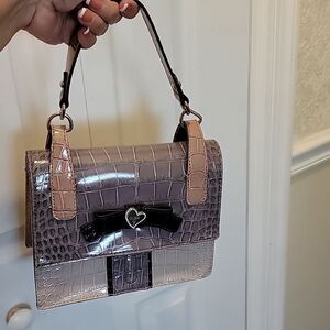 Guess Satchel purse gray/ stone animal print bow heart patent leather.