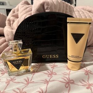 Elegant Guess body lotion. Smooth texture. Ideal for everyday use. Perfume is 2.5 fl oz bottle mostly full. Body lotion is 3.4 fl oz never used. Comes with black bag.