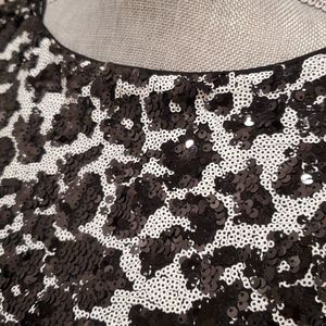 Chic dress is full sequins front and back. Black and white dalmatian type pattern. Great for a formal event or celebration.