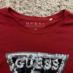 Guess red baby tee with sequined triangle logo in the center. Cap sleeves, crew neck, fitted.