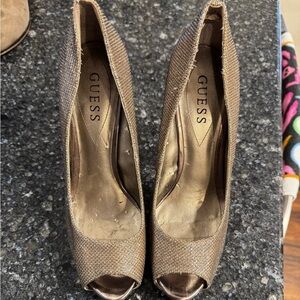 Stylish peep-toe heels with a shimmering gold finish. Perfect for adding glamour to any outfit.