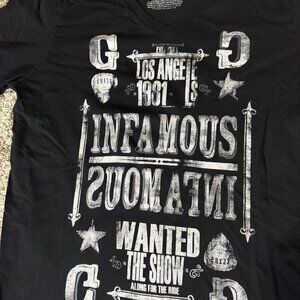Front graphic details include: "Los Angeles 1981", "INFAMOUS", "WANTED THE SHOW", "ALONG FOR THE RIDE", and large "G" elements in a distressed white/gray print.