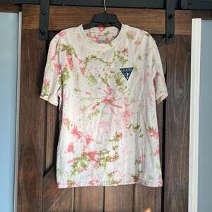 Guess Shirt Mens Small Blue Teal Short Sleeve Henley Button Abstract Psychedelic