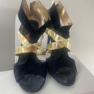 Comfortable Suede Black and Gold strapped sandals. Preloved. From a pet-free and smoke-free home. Size 9.5
