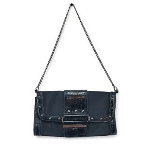 Keywords: GUESS, clutch, chain strap bag, black purse, crocodile embossed, evening bag, party clutch, silver accents, shoulder bag, small bag, designer clutch, flap bag