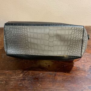 Elevate your accessory game with this chic Guess shoulder bag, a symphony of style and functionality. Wrapped in sumptuous faux leather with a striking black and taupe color block design, this bag exudes sophistication. Gold hardware adds a touch of glamour, while the crocodile print theme injects an air of elegance. Practicality meets panache with features like a secure zip closure, interior zippered pocket, slip pockets, and a matching wallet to keep essentials organized. Chain link strap accents provide a modern edge, and the included bag charm offers a personalized touch. Perfect for the woman on-the-go who refuses to compromise on style or efficiency. This pre-owned treasure is in excellent condition, with no noticeable damage, measuring 16” wide, 10” deep, and a 4.5” base.