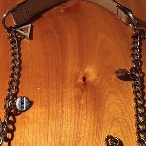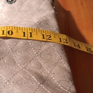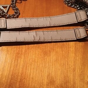 Chic and versatile beige women bag with chain strap. Perfect for any occasion. Pre owned, some wear on straps, very cool with charms on the chain. inside looks good.