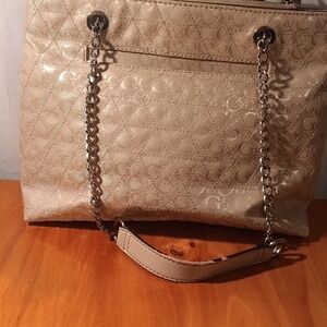 Chic and versatile beige women bag with chain strap. Perfect for any occasion. Pre owned, some wear on straps, very cool with charms on the chain. inside looks good.