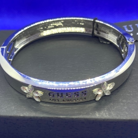 ITEM: Guess Silver Logo Emblem Floral Accent Hinge Bangle Bracelet