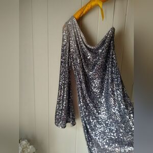 Turn heads the moment you walk in wearing this dazzling Guess silver ombre sequin mini dress, brand new with tags. This eye-catching party piece features a one-shoulder neckline with a dramatic bell sleeve, a flattering bodycon silhouette, and a stunning ombre fade from deep charcoal to silver that shimmers with every move. Perfect for holiday parties, nights out, bachelorette celebrations, or any event that calls for a little extra sparkle.