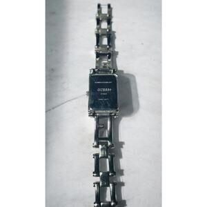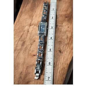 A striking Y2K Guess silver-tone crystal bracelet watch with that unmistakable early-2000s glam. The long rectangular face, mirrored silver dial, and full crystal bezel give it that chic, polished, “it girl” sparkle — the perfect piece for stacking with bangles or wearing as a statement on its own.