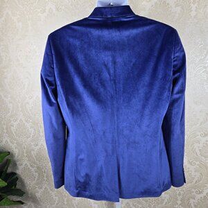 Blue velvet blazer has black lapels. 1 button front closure. Chest pocket and two lower front pockets (seams still sewn shut). Back vent for ease of movement. No interior pockets. Long sleeves with 4 decorative black buttons at cuffs.