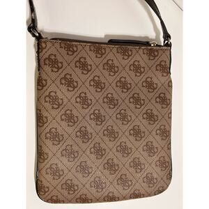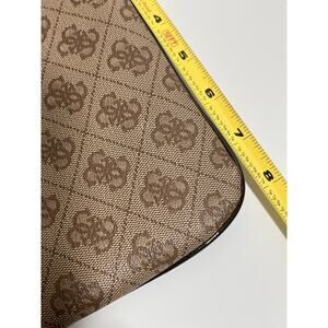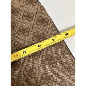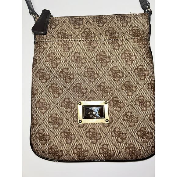The Guess Skya Mini Monogram Crossbody Women's Bag is a stylish and practical accessory for casual occasions. Made from faux leather with a monogram pattern, this small rectangular bag features a zip closure and brown handle/strap. The interior is lined with fabric and includes inner and outer pockets for organization. With gold hardware accents and a zip-around feature, this packable bag from the Guess Collection is both trendy and functional, perfect for the modern woman on-the-go.