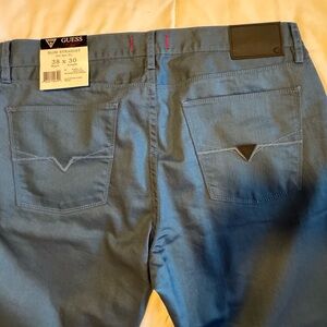Guess Slim Straight Del Mar Fit Stormy Blue color Pant Size 38x30 Classic denim with bold black button. Iconic Guess branding.