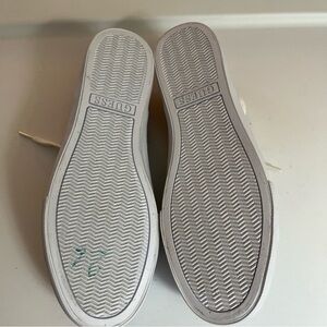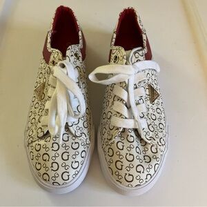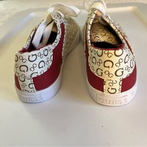Guess sneakers. Man made tops which are wipeable. Cream colored with tan G and gold eyelets and gold triangle with Guess. Size 7.