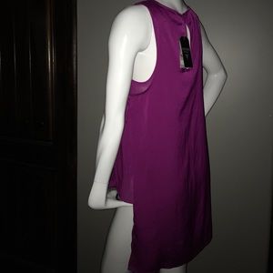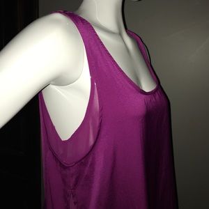 Woven top. Scoop neck. Sleeveless. Attached chiffon tank. Keyhole opening at back with button closure. High-low hem line. 100% polyester. Color Raspberry Rush.