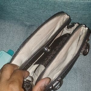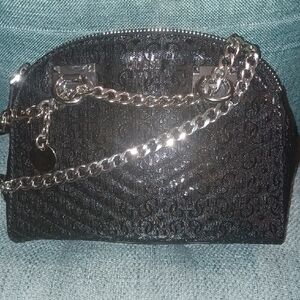 Chic Guess black bag with monogram all over and glossy finish. Hardcore high polish silver hardware.