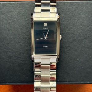 Chic Guess watch with a sleek rectangular face. Black dial with silver accents. Polished silver metal band.